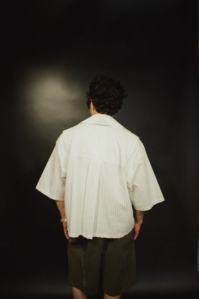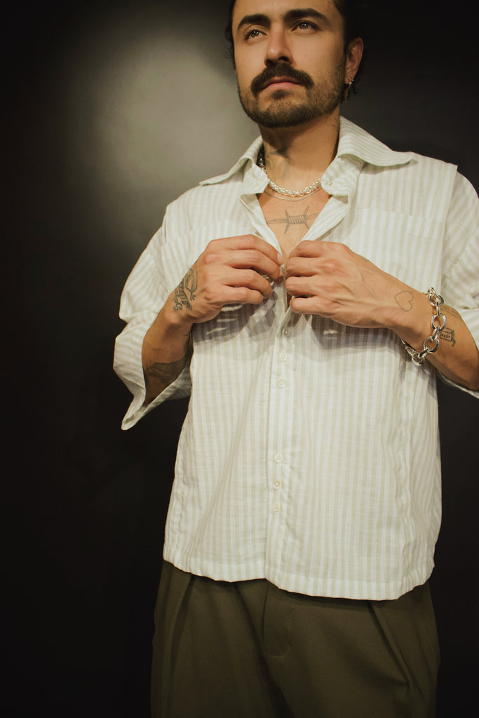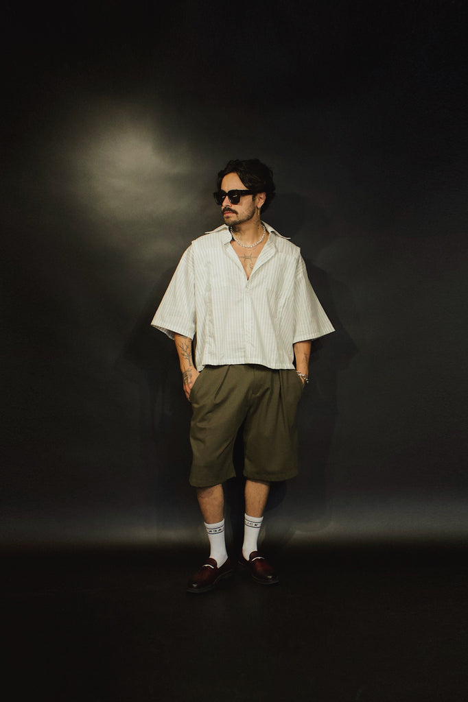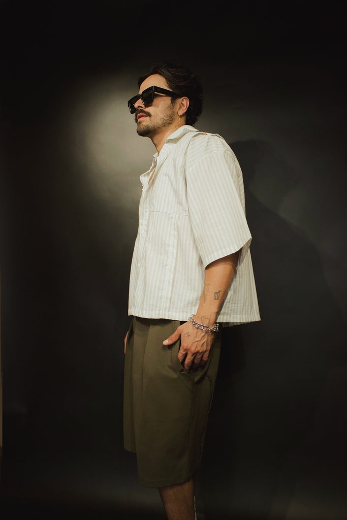 - Juan esta usando la camisa PIERO rayas con los shorts Gaspar oliva.