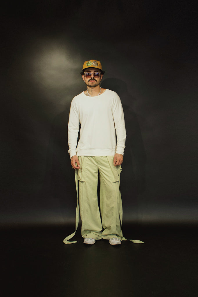 - Juan esta usando el pantalón Mangle con el buzo manta crudo.