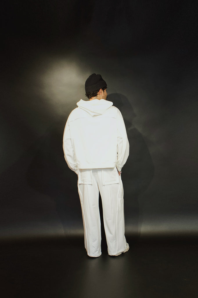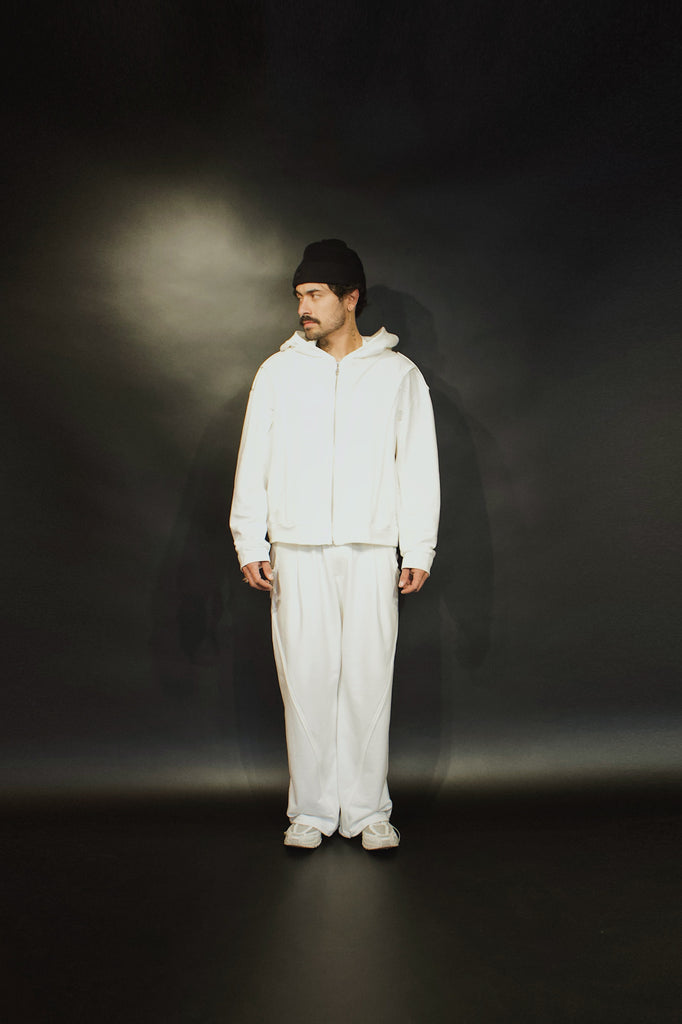 - Juan esta usando el hoodie Belisario con el sweet pant Granada en set.
