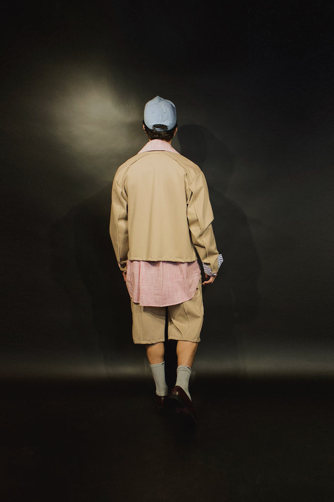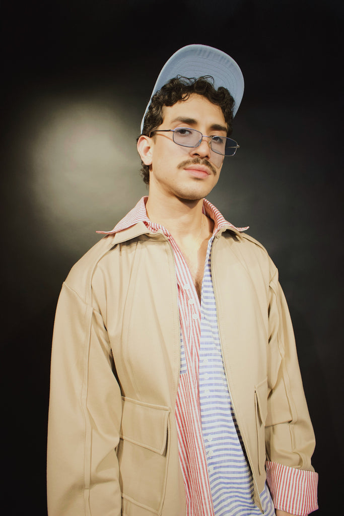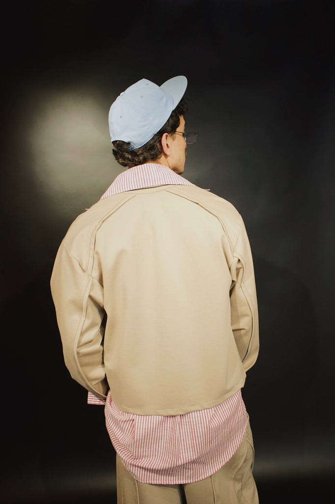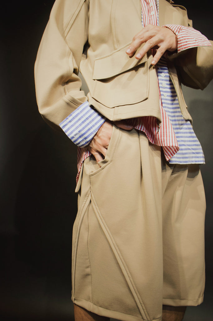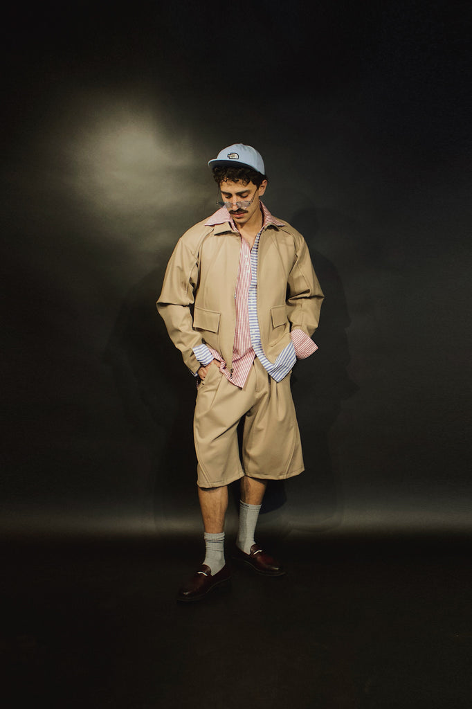 - Jose esta usando la chaqueta prego beige con los short granada y la camisa Bellini.